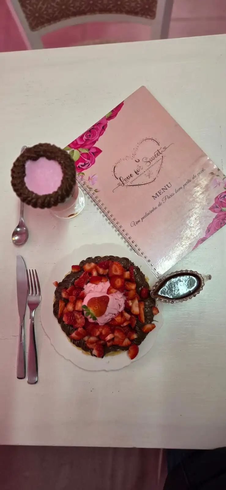 Pedimos o waffle love que tem no recheio Nutella, morango e sorvete. E entramos no embalo do cor de rosa e pedimos para beber o Choco pink, que é feito de brigadeiro rosa, chocolate quente cremoso e leite vaporizado com borda de Nutella.